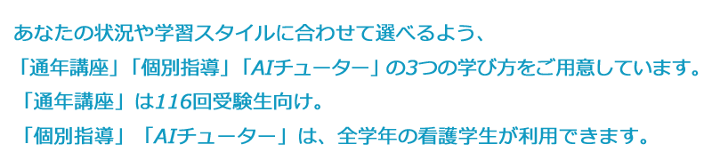 「通年講座」「個別指導」「AIチューター」の3つの学び方をご用意しています。